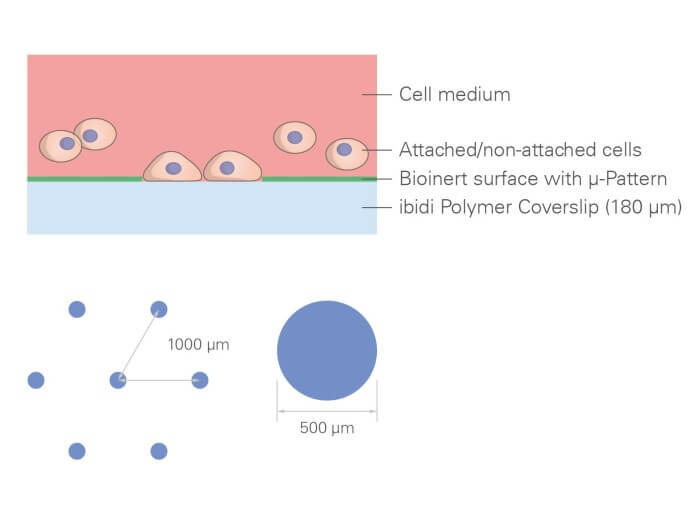 ibidi µ-Patterning技術為各種球體和類器官應用提供空間限定的細胞粘附區域。微型粘附圖案被不可逆地壓印在 ibidi Polymer 聚合物蓋玻片的 Bioinert 生物惰性非粘附性表面上,從而可以精確控制細胞粘附。µ-Pattern具有干燥穩定性、無菌性和即用性。ibiTreat µ-Pattern圖案在相差顯微鏡下弱可見,但在熒光顯微鏡下不可見。